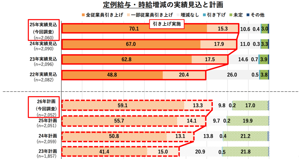 商工中金の調査(2025年12月発表)では、中小企業の72.4%が2026年も賃上げを予定しています。