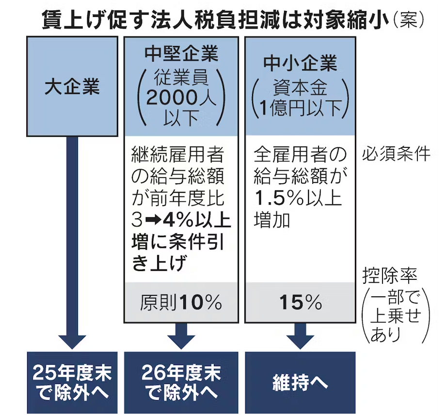 - 中堅企業向け: 賃上げ要件の引き上げ(継続雇用者4%以上)等の見直しを行った上で、2027年(令和9年)3月31日をもって廃止